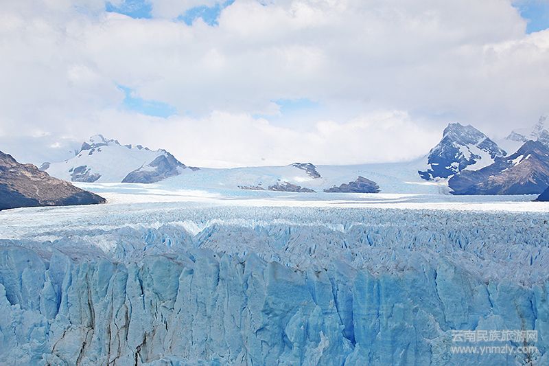 一步一步接近你。風微涼,我的眼睛里滿滿都是你。潔白,壯觀,剛毅,堅硬,在山谷間波濤洶涌般起伏。清晨的空氣中有聲音傳來,“噼啪,噼啪”,如此寂靜的地方是什么聲音響起?雪山后面有人家?一時竟有些恍惚。沿木棧道再走近莫雷諾冰川,現(xiàn)在可以清晰地看到冰川陡立處縱剖面如大理石般的紋理斜飄在淡藍色的冰面,那是一條條巧克力色的飄逸的線。云朵在天空變化無窮。在冰川縱的縫隙間,陰影投在平面的冰上,使整個冰面有了移動的感覺,忽然灰色,忽然白色。啪啪,啪啪,一聲又一聲如鞭炮的聲音在冰舌深處傳來,恍惚間是身處中國某一地的大年夜一般。啪、啪啪,大的聲音響起,有回聲從冰山彈回。如鞭炮噼噼啪啪,哦,是冰崩的聲音!冰崩!遠處淡灰色的山披著白雪在云霧中亮了起來,山的背后就是智力了。啪啪,啪啪,如爆破一般的聲音間或響起,聲音來自不同方向,此起彼伏,奇妙得很。