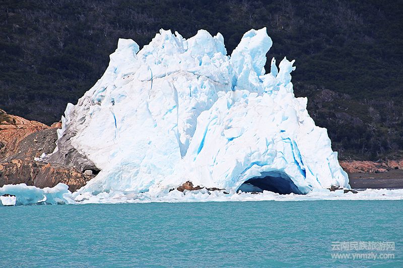 漸漸走近你,莫雷諾。我看見了獨特的冰藍色從大片的白色中透出來,平鋪在山脊間的冰川如濤濤江河從雪山奔涌而來,順著阿根廷湖一瀉千里之勢的奔騰著,突然就停住了,齊齊整整的停住了,不可思議的陡然立住了。 莫雷諾,為什么你這個有20萬年歷史的地球上仍在向前推進的少數(shù)活冰川會突然止住腳步,在阿根廷湖里挺起你20層樓高的身姿,綿延30公里?此刻,我只能靜靜站在你的身邊,扣問靜默的你,驚異于你的美麗。