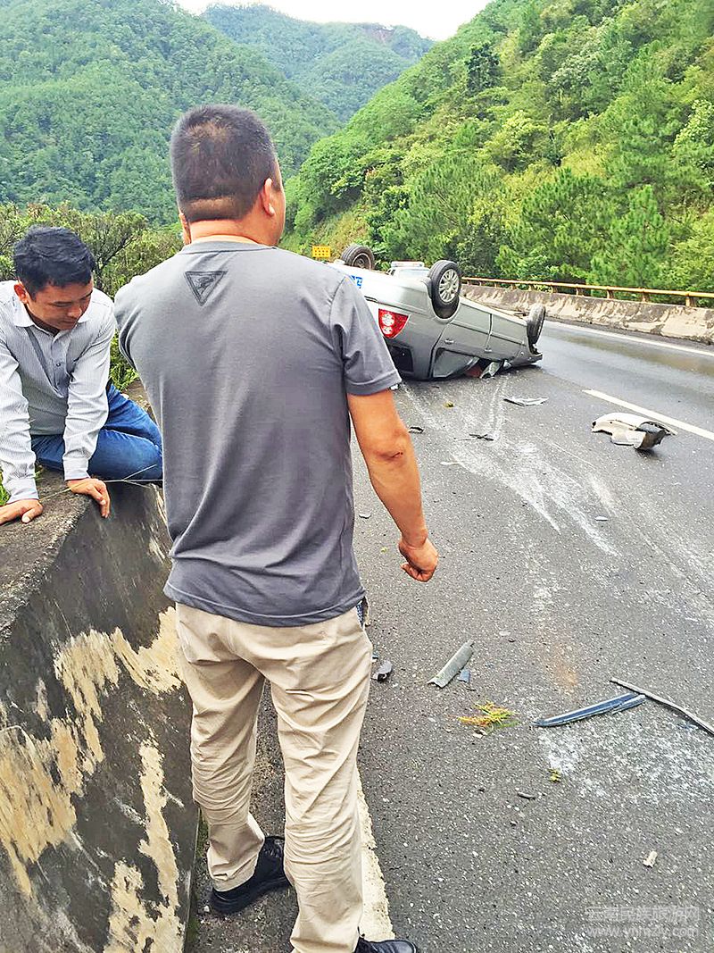 9月18日下午,元磨高速通關(guān)至把邊路段下起雨來。27公里的長下坡路段上,彎道一個接著一個,連續(xù)轉(zhuǎn)彎、下坡和雨幕的遮擋,讓從昆明駕車到普洱的郭文寶有些緊張。在下一個彎道后的大坡時,郭文寶剎車失靈,車輛失控后撞到路邊的護(hù)欄上。在連續(xù)的碰撞后車輛倒扣過來,在坡道上滑行了100多米才停下。