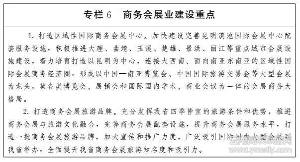 充分利用我省獨(dú)特的沿邊區(qū)位優(yōu)勢及發(fā)展商務(wù)會(huì)展的良好基礎(chǔ)條件,以昆明、大理、玉溪、曲靖、楚雄、景洪、麗江等重點(diǎn)城市為依托,加快昆明滇池國際會(huì)展中心等會(huì)展設(shè)施建設(shè),著力辦好中國—南亞博覽會(huì)和中國國際旅游交易會(huì),積極組織招徠大型商務(wù)會(huì)展活動(dòng),不斷提高商務(wù)會(huì)展服務(wù)水平,把我省建設(shè)成為我國面向南亞東南亞的區(qū)域性國際商務(wù)會(huì)展中心。鼓勵(lì)支持跨國集團(tuán)、大企業(yè)集團(tuán)以我省為總部基地,舉辦面向南亞東南亞的各類重點(diǎn)展會(huì)、大型會(huì)議和獎(jiǎng)勵(lì)旅游等。充分利用全省各地文物博物館和文物藏品,舉辦情趣高雅、寓教于樂,群眾喜歡、游客慕名而來的各類文博展覽會(huì)等。積極引進(jìn)國內(nèi)外知名會(huì)展企業(yè)來滇創(chuàng)辦會(huì)展企業(yè),鼓勵(lì)社會(huì)資本進(jìn)入會(huì)展行業(yè),打造策劃、代理、廣告、宣傳、工程等會(huì)展全產(chǎn)業(yè)鏈產(chǎn)品,培育提升“南博會(huì)”“旅交會(huì)”“農(nóng)博會(huì)”“文博會(huì)”等一批國際商務(wù)會(huì)展品牌,不斷提高商務(wù)會(huì)展品牌價(jià)值和效益。