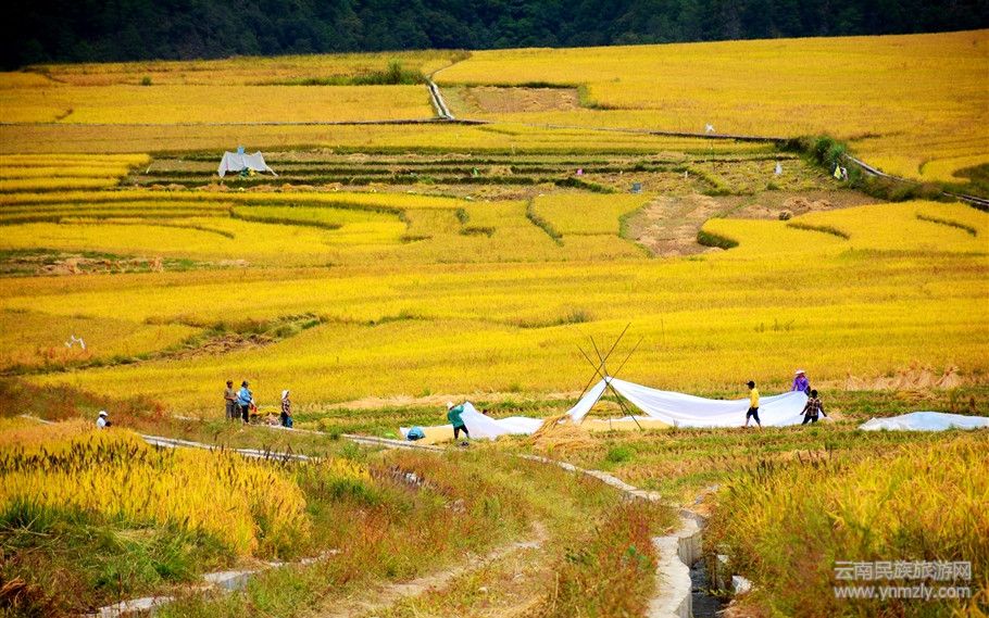 從普化寺出來,我們一路向前,由于修建公路,我們不得不從小路走,時逢秋收,我們駐足在貢當神山下的村子,原野飄過稻香。勤勞的農(nóng)民正在揮著手中的鐮刀,將稻子割下。楊大媽告訴我,她從早上就下地了,收割完稻子正準備回家。她看我未帶干糧和水,便從她的簍里拿出她的水遞給我。萍水相逢的人能夠如此,倍感暖心。