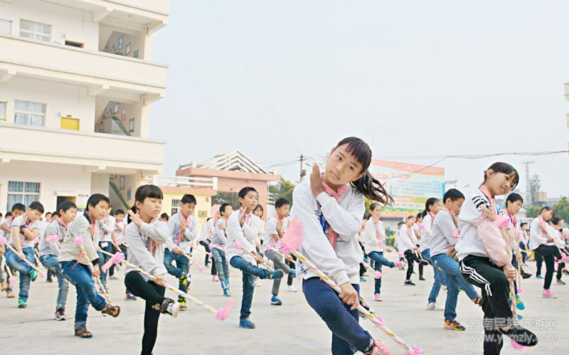 蒙自市草壩中心學(xué)校長期重視挖掘,整理,傳承民族文化精髓。本學(xué)期開始,把當(dāng)?shù)貍鹘y(tǒng)的彝族霸王鞭編成課間操,在全鎮(zhèn)10所完小中推廣,目的是讓師生在健身強體的課間操中傳承民族文化精髓。
