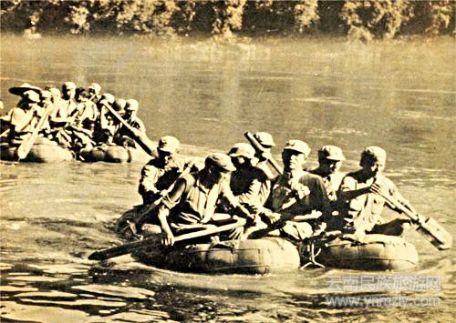滇西抗戰(zhàn)期間,遠(yuǎn)征軍用橡皮艇進(jìn)行渡怒江模擬訓(xùn)練。