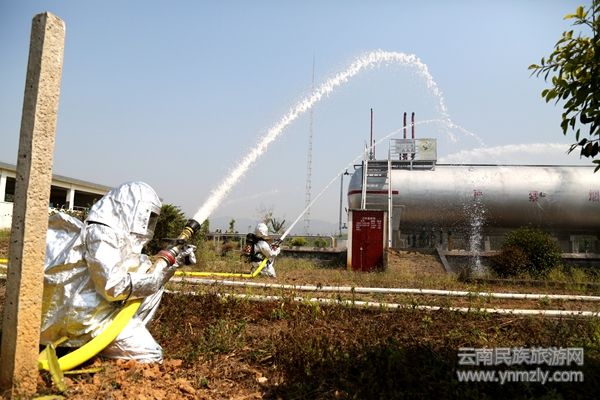 演練災(zāi)情設(shè)定為9時30分,西雙版納石化集團勐養(yǎng)液化石油氣儲備點1號儲罐閥蘭損壞泄漏,3名工人正在對儲罐進行檢修,1名工人違章使用帶火花工具作業(yè),火花噴濺引燃空氣中的液化石油氣,火勢較大,隨時有發(fā)生爆炸的危險,同時現(xiàn)場有人員受傷,情況十分緊急。液化氣站工人立即撥打119報警,然后立即引導(dǎo)員工有序疏散。