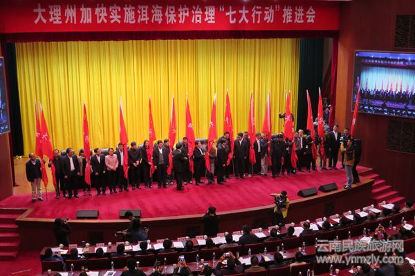 大理州政府副州長楊承賢在推進(jìn)會上宣讀了《中共大理州委辦公室大理州人民政府辦公室關(guān)于成立洱海保護(hù)治理“七大行動”指揮部和派駐工作隊的通知》,中共大理州委、州政府向大理州洱海保護(hù)治理“七大行動”指揮部和16支工作隊授牌授旗。(記者 楊鳳池)