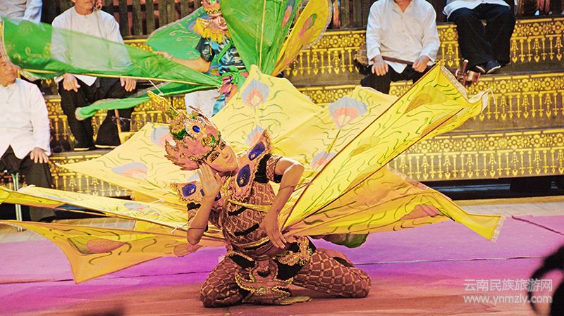 “《嘎婻啰》是傣語(yǔ),即孔雀羽毛舞的意思。古時(shí)候,只有在傣王的王宮里才可以看到這種表演……”隨著主持的講解聲,一隊(duì)男子畫(huà)著臉、戴著面具,在舞臺(tái)上瀟灑地做著各種動(dòng)作。