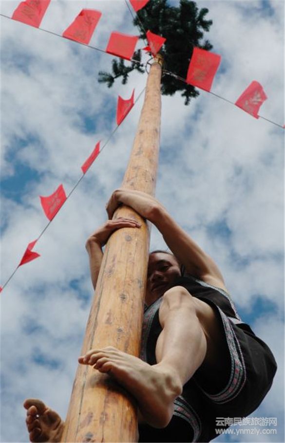 苗族的酒文化底蘊深厚,客人在進寨門之前,在高亢嘹亮的酒歌助興下,首先喝上一杯攔寨酒,方能入村做客。苗族長老帶領自己的同胞在花桿下進行祭拜“花桿儀式”,保佑倒爬花桿的小伙子們平安爬到桿頂,展示民間競技的風采。“倒爬花桿”是苗族獨有的民間競技項目,在花山節(jié)場上,苗族小伙們鼓足勇氣、爭先恐后地展現(xiàn)自己的本領,希望找到自己喜歡的姑娘。