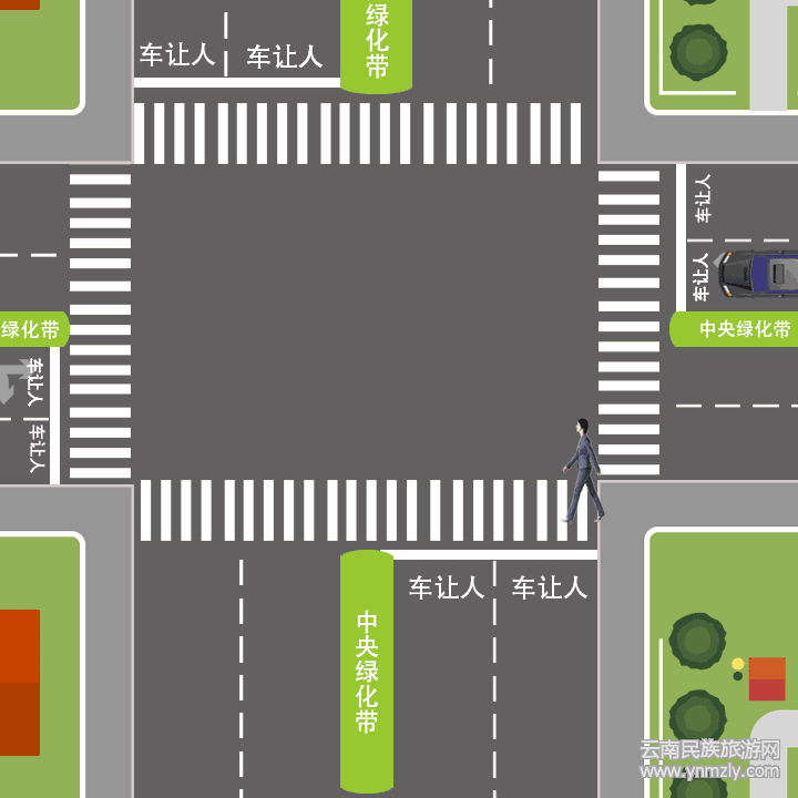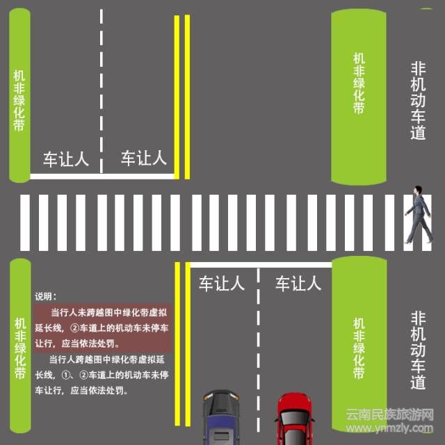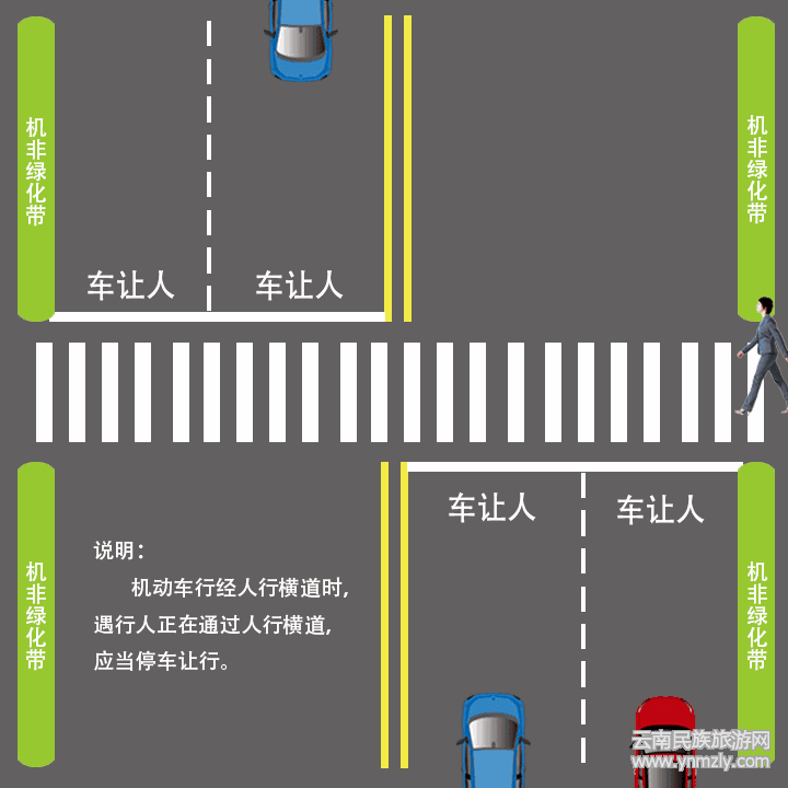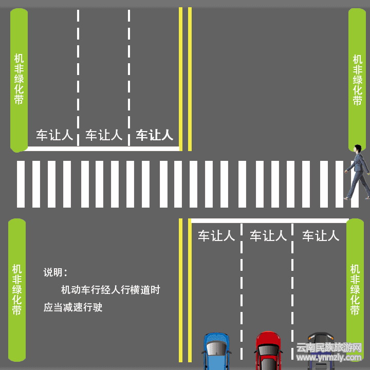 當(dāng)車輛行經(jīng)人行橫道,行人步入斑馬線時,最靠近行人車道內(nèi)的車輛必須禮讓行人;行人開始通過斑馬線,所在車道車輛和下一車道車輛必須讓行;行人到達(dá)中央綠化隔離帶或雙黃線,下一車道車輛必須讓行。