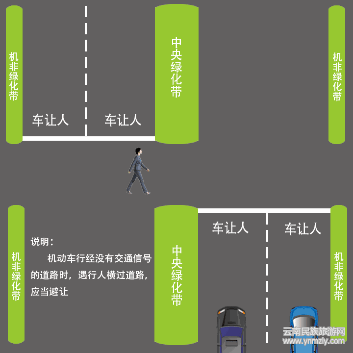 當(dāng)車輛遇行人正在通過人行橫道時,應(yīng)當(dāng)停車讓行;道路中央有雙黃線或隔離欄,無綠化隔離帶,行人步入斑馬線,車輛必須讓行。