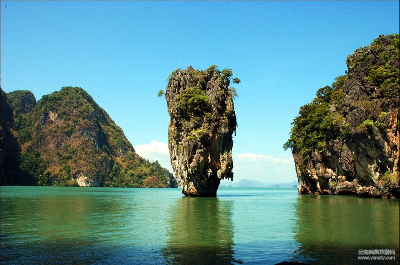 位于普吉島東北角75公里處,屬于攀牙府,被譽(yù)為全島風(fēng)景 最美麗的地方,有泰國(guó)的"小桂林"之稱。 這里遍布著數(shù)以百計(jì)的石灰?guī)r小島,小島的名稱與其形狀極為吻合。還有巧奪天工的鐘乳石巖穴和數(shù)不清的怪石、海洞。其中007島(也稱鐵釘島)、鐘乳島石洞(即佛廟洞和隱士洞)更以其天然奇景而著稱。海灣內(nèi)遍布珍貴的胎生植物紅樹林,紅樹林與小漁村之間有河道,可坐在小船上觀賞紅樹林和小漁村。去攀牙灣需坐車過(guò)跨海大橋到攀牙府,從普吉坐班車出發(fā)2小時(shí)到,36泰銖,每天有五班。然后坐長(zhǎng)尾船或快艇去007島。