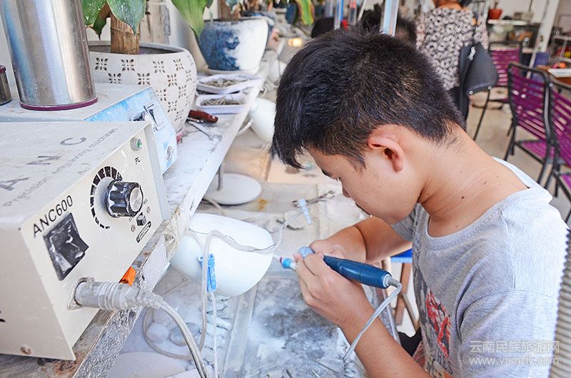 今年26歲的景頗族小伙子來馬南是德宏芒市人,這個左腿殘疾的年輕人在玉雕工作室學(xué)習(xí)玉雕已經(jīng)四年了?,F(xiàn)如今,來馬南以嫻熟的玉雕技術(shù)已成為玉雕工作室里小有成就小師傅,平日里師傅方卡華出門談生意不在工作室的時候,都是他在耐心地教其他幾位小師弟們雕刻。“來我們這里學(xué)習(xí)玉雕的大多數(shù)都是殘疾人,方師傅對每一位學(xué)員都很細心,他不止耐心的教大家怎么雕刻,還每個月給大家一些生活費、零花錢。在這里,我們就像在一個大家庭里,安心的學(xué)習(xí)、快樂的生活。雖然大家都說我是這里學(xué)得最好的徒弟,但我還是想多跟著方師傅學(xué)習(xí)幾年,把玉雕技藝在提升一些。”靦腆不多話的來馬南說起幾年來在工作室的點滴生活,臉上微微露出了笑容。