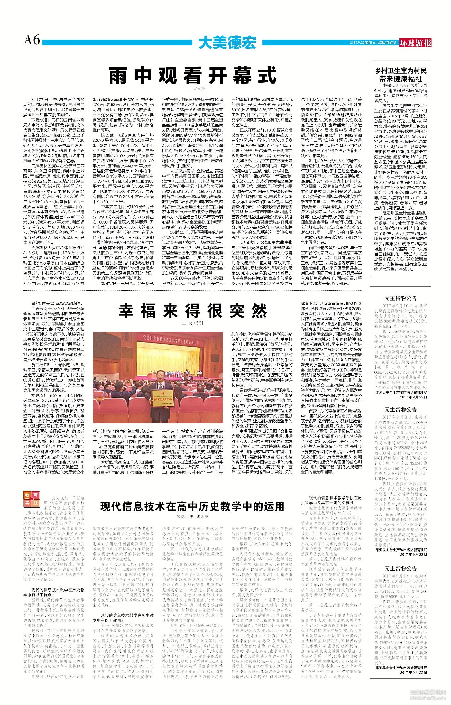 代表云南十六個(gè)州市唯一榮獲全國體育系統(tǒng)先進(jìn)集體的德宏傣族景頗族自治州文體廣電局出席全國體育系統(tǒng)“雙先”表彰會(huì)并參加全國第十三屆運(yùn)動(dòng)會(huì)開幕式的我,入駐下榻的天津迎賓館不久,就接到參加完聯(lián)絡(luò)員會(huì)議的云南省體育局人事處副處長楊茜的通知:“明早參加習(xí)總書記的接見,位置在站位第二排,你還要參加28日的表彰頒獎(jiǎng),請(qǐng)嚴(yán)格按要求做好相關(guān)準(zhǔn)備。”