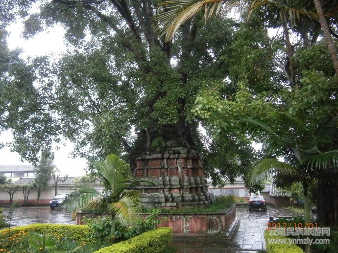 “大緬寺在威城(參將衙署)北門外。寺內(nèi)有緬僧百余人,皆剃發(fā),用黃布裹身,名緬和尚。臥佛寺中有塔二座,高三丈余,昔土官刀漢臣所建。臥佛寺左塔中生緬樹,其枝從石縫周圍伸出,枝葉甚茂,塔石不崩,至晚眾烏聚集歡嗚于上,緬僧皆稱奇焉,名日塔樹,至今猶然。”