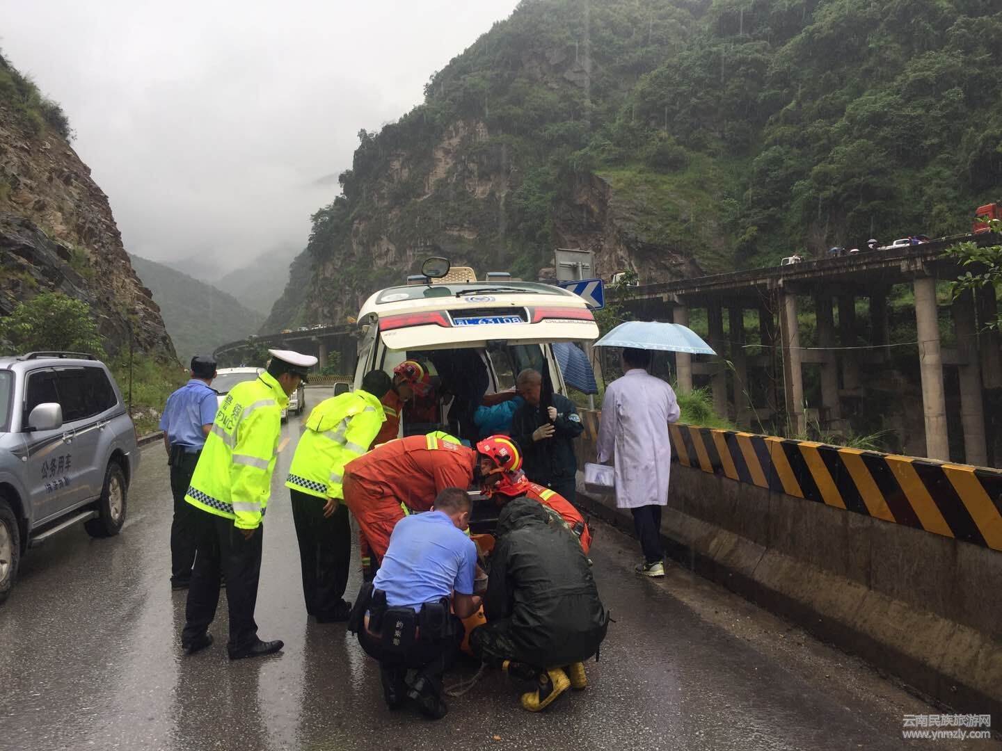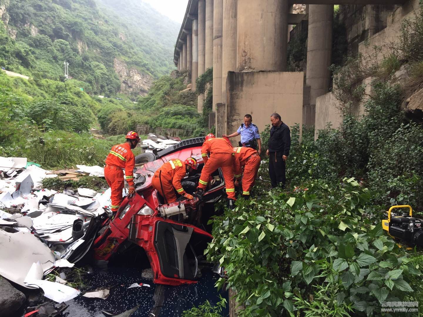 2017年8月29日凌晨8時許,30多歲的張虎駕駛自己的一輛紅色大型貨車從大理往保山方向行駛,因前晚暴雨,大保路太邑段山體滑坡,山石滾落,雙邊道路受阻。此時天色朦朧,車輛行駛到落石路段時,由于是長下坡,加之車速過快來不及剎車避讓前方側(cè)道的五輛小車和落石,張虎連人帶車從30多米高的橋梁墜下。幸而公安、消防、衛(wèi)生和當(dāng)?shù)厝罕娊M成的救援隊伍快速到達(dá)現(xiàn)場,大家齊心協(xié)力經(jīng)過近兩小時的全力救援才使張虎安全獲救,沒有釀成悲劇,但是,車輛已經(jīng)完全報廢,除了幾個車輪還連著軸外,其它車體、部件已散落在山谷之中,現(xiàn)場一片狼藉。