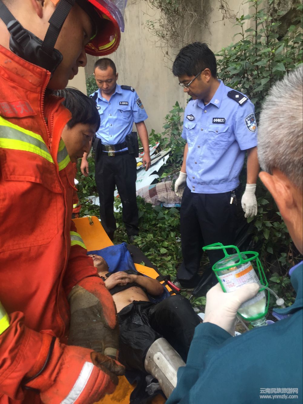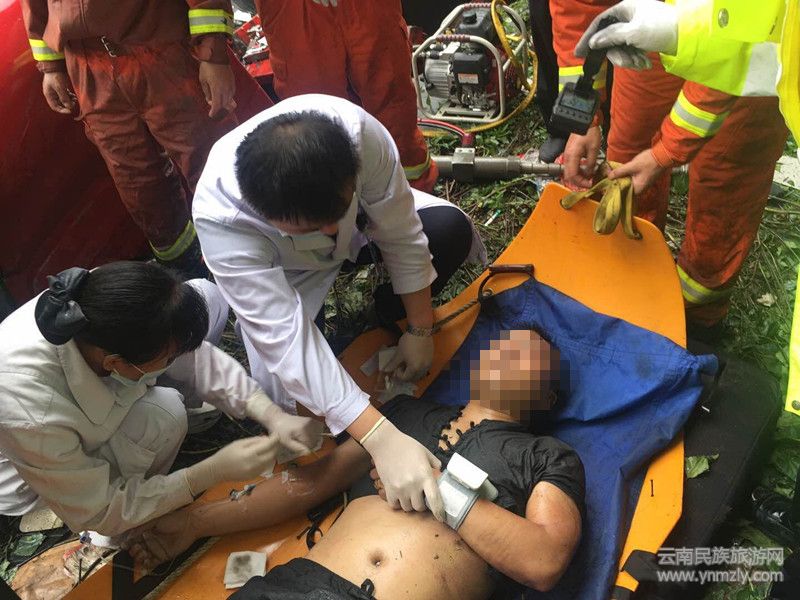 很快,消防官兵、交警、120急救人員也先后趕到了事故現(xiàn)場,大家一起展開救援。由于駕駛員的下肢被變形的車體卡住,半個身體都浸于河水中,救援工作十分困難,如果不能及時將被困人員救出,因下雨而暴漲的河水將對被困人員的生命構(gòu)成第二次重大危脅。經(jīng)驗豐富的消防官兵在公安民警和當(dāng)?shù)卮迕竦膮f(xié)助下,冒著大雨在借助消防專業(yè)破拆工具的同時就地取材,加快救援速度,通過現(xiàn)場全體人員齊心協(xié)力近兩個小時的不懈努力,終于成功將駕駛員從駕駛室救出。大家小心翼翼地把駕駛員抬上120救護(hù)車,飛速送往大理州第一人民醫(yī)院進(jìn)行救治。