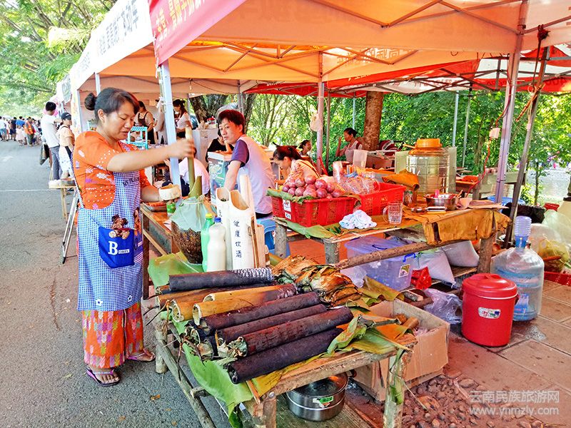 看這邊傣族阿姨剛把油鍋里炸得金黃的炸馬蹄菜從鍋里撈出來(lái),就有人買走了;路邊幾個(gè)買竹筒粑粑的咩巴打開了一只竹筒,露出紅糖糯米做的粑粑,立刻讓人回想到無(wú)憂無(wú)慮的童年。
