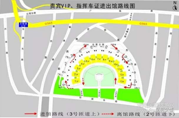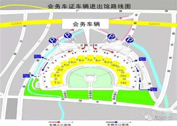 開幕式當天,持組委會加貼開館儀式特殊標識的貴賓VIP車證車輛及指揮車證車輛到達滇池國際會展中心現(xiàn)場后,由會展北路,經(jīng)3號匝道進入三層外環(huán)道路,車輛沿三層外環(huán)道路順時針行至三層內(nèi)環(huán)道路,沿三層內(nèi)環(huán)道路逆時針行至貴賓廳門前停車下人,空車停放于三層平臺指定位置順序停放,離場時由2號匝道、會展北路駛離。