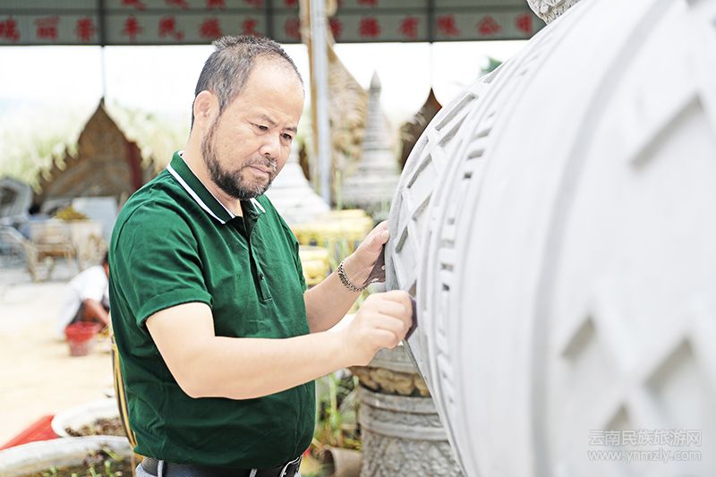 自完成姐告國門裝飾以后,張國榮在瑞麗的名聲大震。隨著人們?nèi)諠u重視民族文化,張國榮接到的工程也越來越多,但他并沒有因?yàn)樯庾龃罅硕?dāng)甩手掌柜,他還是親力親為。他還是改不掉反復(fù)推敲和修改的“毛病”,用工匠精神精雕細(xì)琢、精益求精。因?yàn)樗M恳患髌范际亲詈玫?。正是憑著這么一股子工匠精神,他很快得到了各界認(rèn)可。