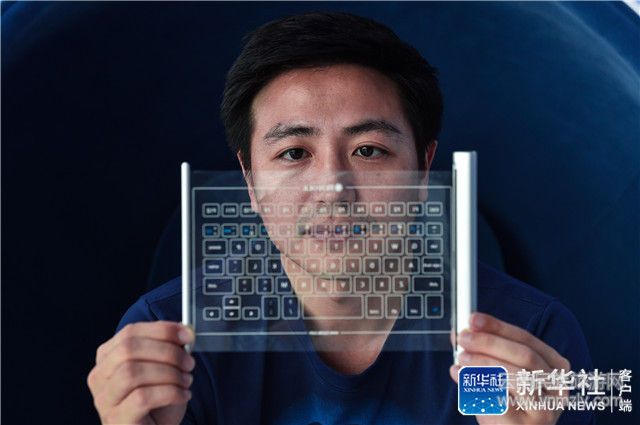 8月18日,柔宇科技創(chuàng)始人、董事長兼CEO劉自鴻在廣東深圳柔宇科技總部展示應(yīng)用了柔性傳感技術(shù)的柔性鍵盤。新華社記者 毛思倩攝