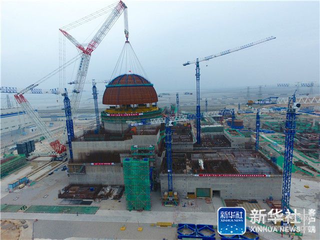 5月25日,“華龍一號”全球首堆示范工程福建福清核電5號機組完成穹頂?shù)跹b。新華社記者 姜克紅 攝