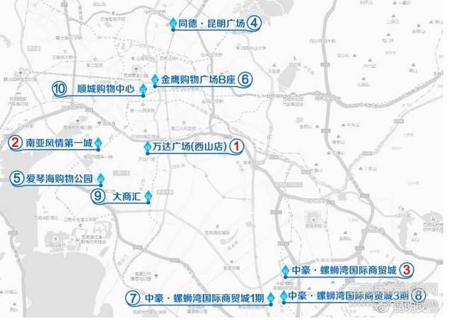 主城區(qū)內,預計元旦節(jié)期間在以下商業(yè)集中區(qū)會出現(xiàn)人、車流交通高峰:萬達廣場(西山店)、南亞風情第一城、中豪·螺螄灣國際商貿城、同德·昆明廣場、愛琴海購物公園、金鷹購物廣場B座、中豪·螺螄灣國際商貿城1期、中豪·螺螄灣國際商貿城3期、大商匯、順城購物中心。