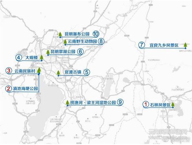 根據高德導航提供數據,全市主要風景區(qū)自駕導航熱門的景點依次有:石林風景區(qū)、滇池海埂公園、云南民族村、大觀樓、官渡古鎮(zhèn)、昆明翠湖公園、宜良九鄉(xiāng)風景區(qū)、云南野生動物園、撈漁河·梁王河濕地公園、昆明瀑布公園。