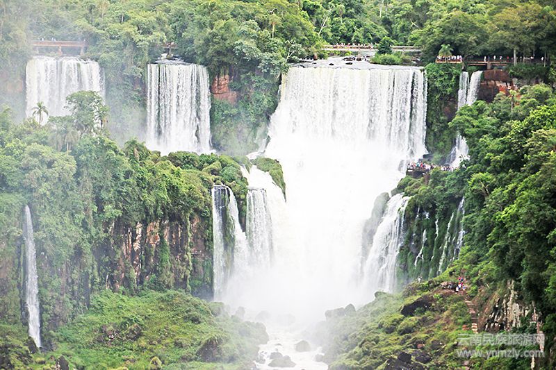 沿步行道沿途觀賞不同大小,不同形狀,不同寬窄的伊瓜蘇瀑布,各有其美。而大瀑布傾倒而下的水霧,則在陽光一出來時,必定生出彩虹。這河谷間不停歇的水霧,彩虹,與森林輝映,與天地共存。奔騰咆哮的瀑布之聲,雷霆萬鈞。