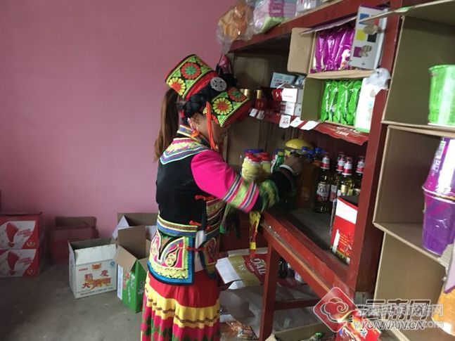 搬遷點里小賣部里,身著艷麗彝族服飾的女主人陸金花整理著貨品,招呼來往的村民。貨架上,各種日用小商品琳瑯滿,不時有附近的村民前來購買商品。