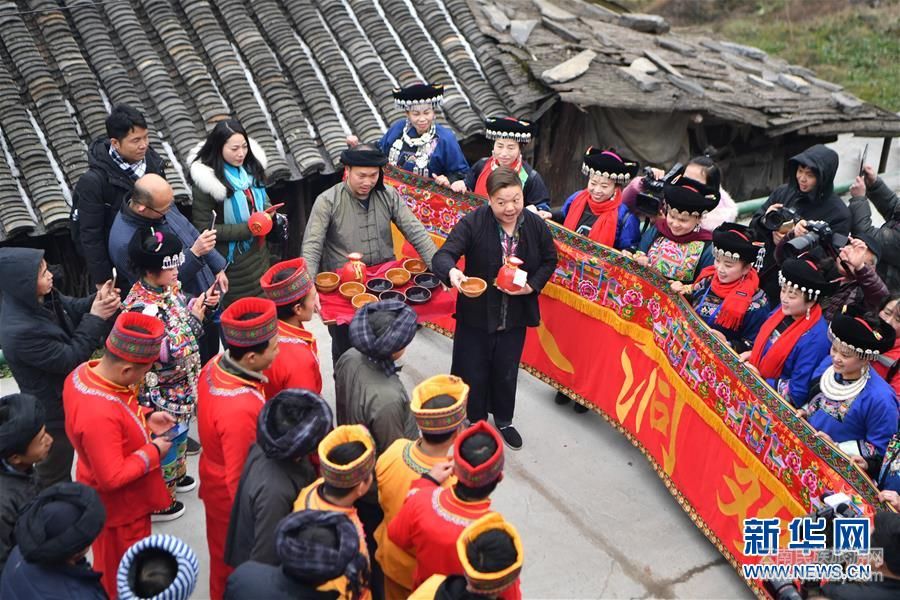 2018年2月4日,在湖南省湘西土家族苗族自治州花垣縣十八洞村,新郎的迎親隊(duì)伍遇上新娘親友攔門(mén)。當(dāng)日,兩對(duì)分別來(lái)自湘西和湘潭的新人特地來(lái)到十八洞村體驗(yàn)苗族婚禮。新華社發(fā)(薛宇舸攝)