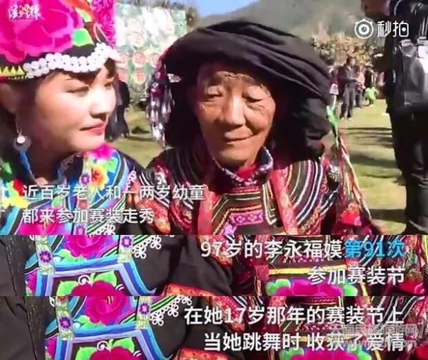 圖中是97歲的李永福嫫和她的重孫女兒,這已經(jīng)是李永福嫫第91次來參加賽裝節(jié)了,17歲,她在賽裝節(jié)上邂逅了自己的愛情,數(shù)載過去,每年的正月十五來賽裝、跳舞,對她來說仍是雷打不動的事。