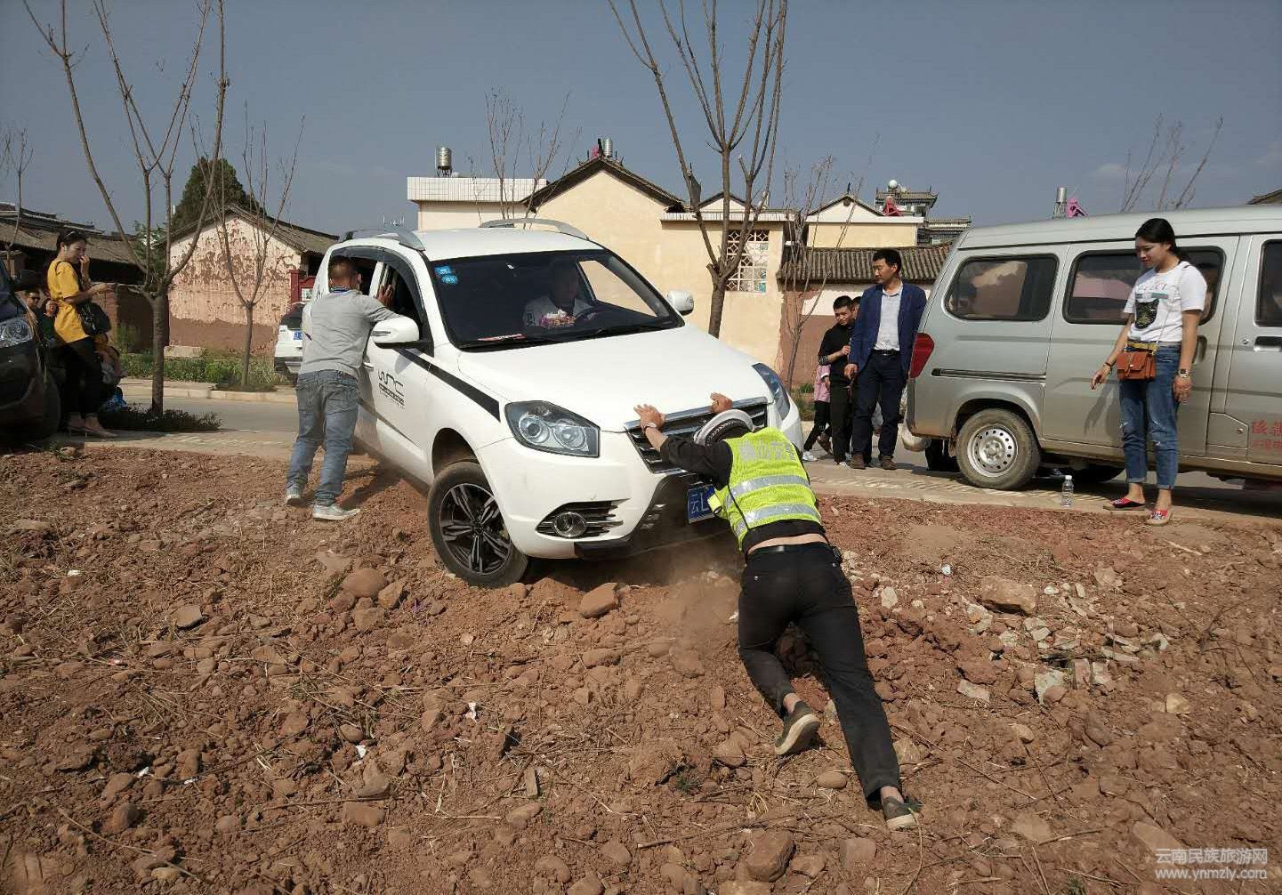 3月25日16時32分,一游客在南詔印象小區(qū)附近路邊停車時操作不當(dāng),將車開至路下。為避免事故發(fā)生,在場執(zhí)勤人員迅速指揮駕駛員及時后退??浚瑸榉乐管囕v再次往下沖,執(zhí)勤人員沒有多想直接用手奮力地往上推著車頭,雖然車輪卷起了大量灰土,但他一直堅持直至車輛化險為夷。