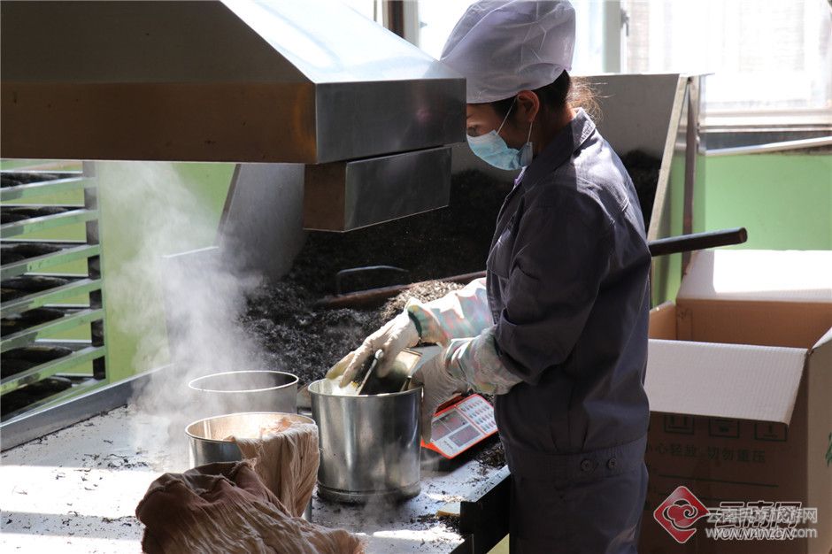 把曬干的茶葉用蒸汽蒸濕。通常蒸半分鐘左右,只要茶軟下來就可以。把鐵桶里面蒸好的茶倒進布袋。根據(jù)需求選擇合適的布袋,如要壓制357克一餅,就裝357克的布袋。