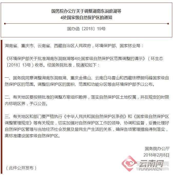 云南網(wǎng)訊(記者 趙黎浩)日前,國務(wù)院辦公廳下發(fā)文件《國務(wù)院辦公廳關(guān)于調(diào)整湖南東洞庭湖等4處國家級自然保護區(qū)的通知》(以下簡稱《通知》),批準云南白馬雪山等4處國家級自然保護區(qū)調(diào)整保護區(qū)范圍。此次調(diào)整將涉及保護區(qū)的面積、范圍和功能分區(qū)等,后續(xù)將由環(huán)境保護部予以公布調(diào)整細節(jié)。