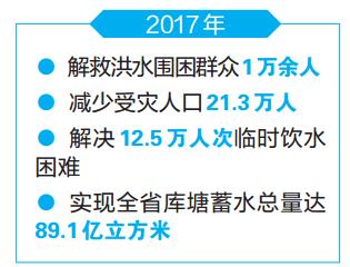 2017年以來,針對全省氣候異常、自然災害頻發(fā)、局部地區(qū)出現(xiàn)較重旱情等嚴峻形勢,我省加強組織領(lǐng)導,省委、省政府主要領(lǐng)導多次作出重要批示,各級黨委、政府及防指及早安排部署,科學謀劃指揮,細化落實責任,加強物資儲備,高效應對災情;層層壓實責任,全面落實以行政首長負責制為核心的防汛抗旱工作責任制;強化監(jiān)測預警,全年共發(fā)布雨情、水情、災害預警等信息8782條(次),及時轉(zhuǎn)移群眾4.7萬人,避免傷亡9300多人;全力抗災救災,出動23.5萬人次參與搶險救災,解救洪水圍困群眾1萬余人,減少受災人口21.3萬人,解決12.5萬人次臨時飲水困難,減災經(jīng)濟效益達3.8億元,確保了全省重要水庫、重要設(shè)施、重點河段安全度汛,2017年末實現(xiàn)全省庫塘蓄水總量達89.1億立方米,創(chuàng)近5年新高。