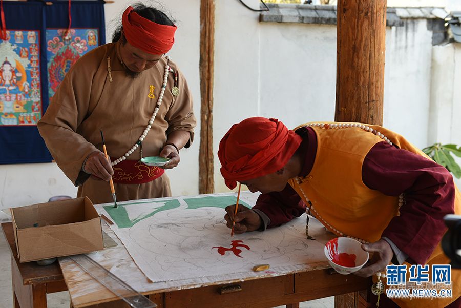 東巴畫傳承人和嘉龍(右)和楊正元一起上色。新華網(wǎng) 李寧 攝