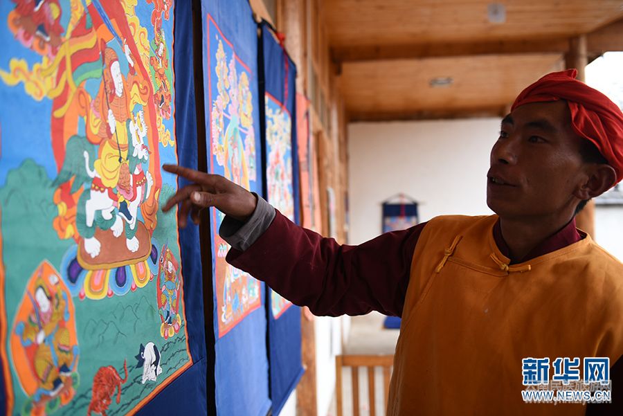 和嘉龍介紹東巴畫。新華網(wǎng) 李寧 攝