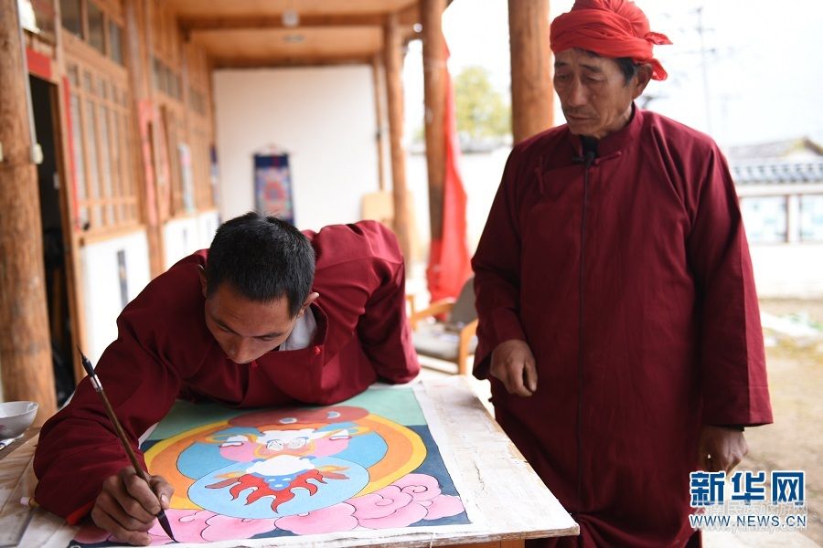 顏色上好后,還要再勾畫一遍線條。圖為云南省麗江市東巴畫省級非遺傳承人和圣典指點和嘉龍勾畫線條。(新華網(wǎng) 韓文萍、馬航/文 李寧/圖)