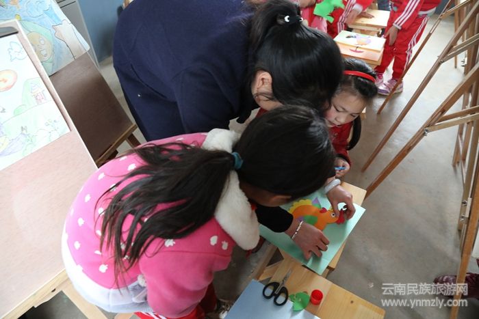 “這里要這樣剪才對,用沾膠的時候要少抹一點,太多了不行,最后再把小雞的尾巴粘上去才行。”來到溪洛渡鎮(zhèn)雪花小學(xué),江宗瓊老師正在為孩子們上剪紙課,在她的指導(dǎo)下,一張張平凡的彩紙在孩子們靈巧的指尖跳動,一幅幅美麗的立體剪紙畫在孩子們愛笑的眼睛中倒映。江宗瓊是2017年的春季學(xué)期參加轉(zhuǎn)崗培訓(xùn)的教師之一,當(dāng)時她的轉(zhuǎn)崗科目是美術(shù),偶然的機(jī)會接觸到剪紙課程,從此她便愛上了這門藝術(shù)。