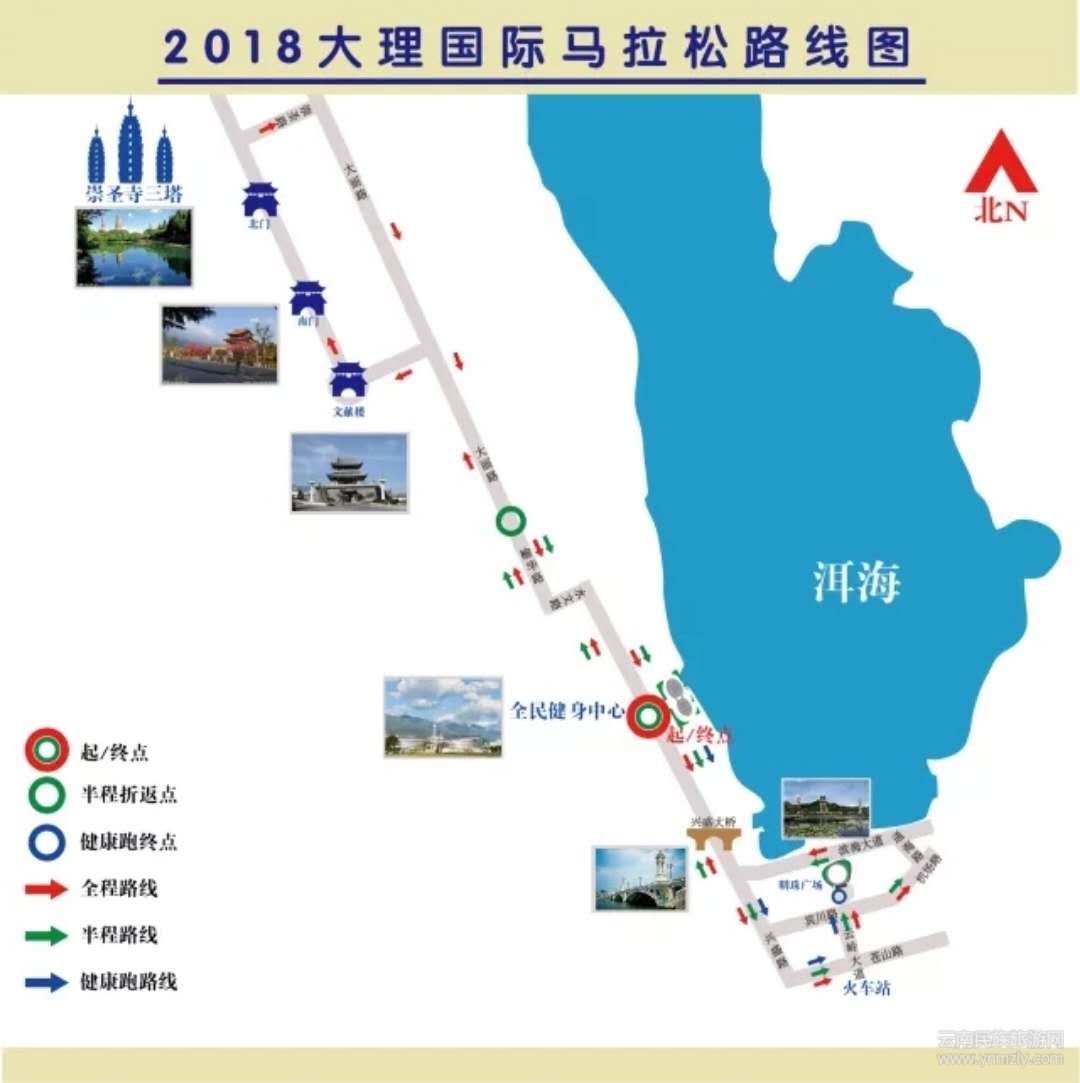 1、全程馬拉松:起點(diǎn)(大理全民健身中心)--興盛路--興盛橋--蒼山路--云嶺大道--賓川路--機(jī)場(chǎng)路(左拐)---濱海大道--興盛橋--興盛路--水文路--榆華路--大麗路(左拐)--文獻(xiàn)樓--古城南門--復(fù)興路--古城北門--北門街(直行)--崇圣路(右拐)--大麗路--榆華路--水文路---興盛路——大理全民健身中心(終點(diǎn))