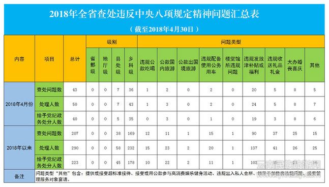 2018年4月,云南省各級紀檢監(jiān)察機關查處違反中央八項規(guī)定精神問題43起,處理50人,給予黨紀政務處分40人。