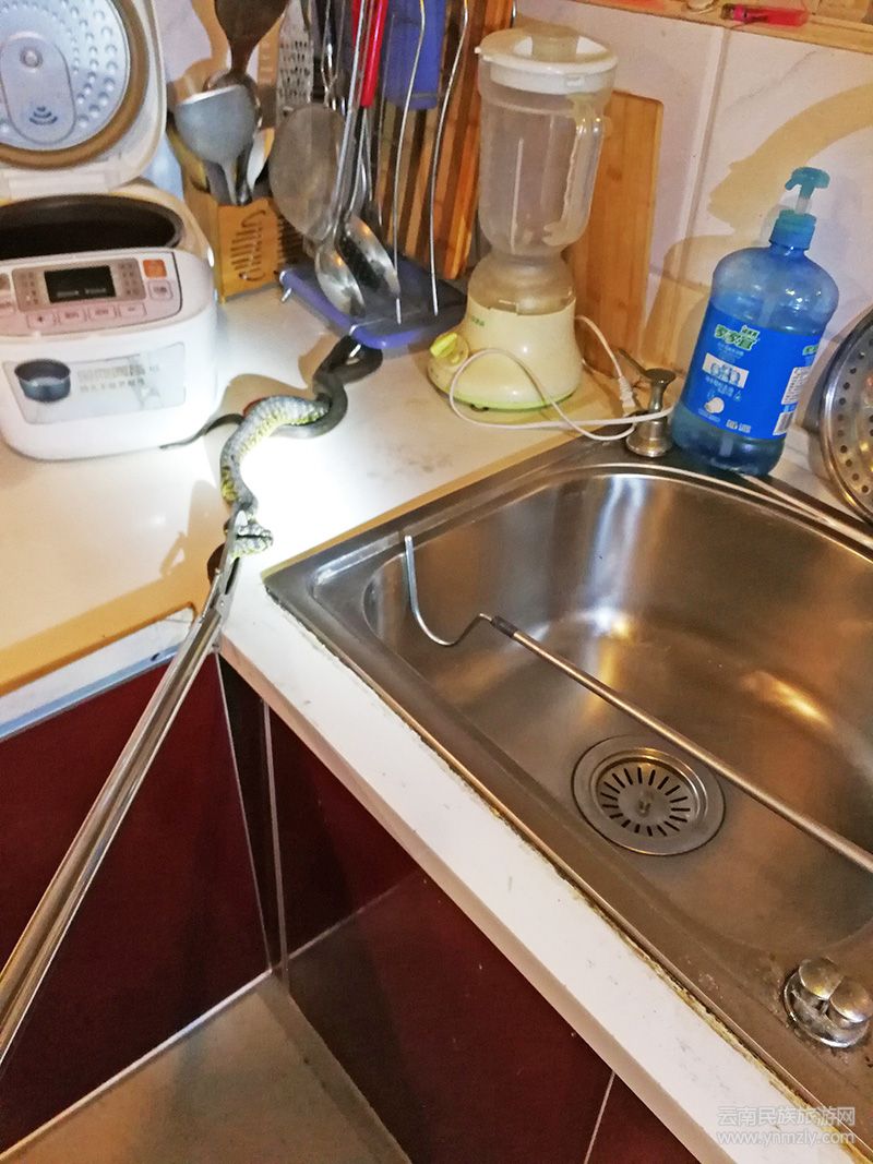 6月20日22:30分許,大理古城的楊先生已準(zhǔn)備就寢,突然聽到廚房里傳來異常的聲音,以為是家里進(jìn)老鼠了,于是起身去廚房檢查,誰知?jiǎng)偺崞鸱胖缅佺P、湯勺等廚具的收納架,就鉆出一條菜花蛇,毫無心理準(zhǔn)備的楊先生嚇壞了,于是報(bào)警請(qǐng)求救助。