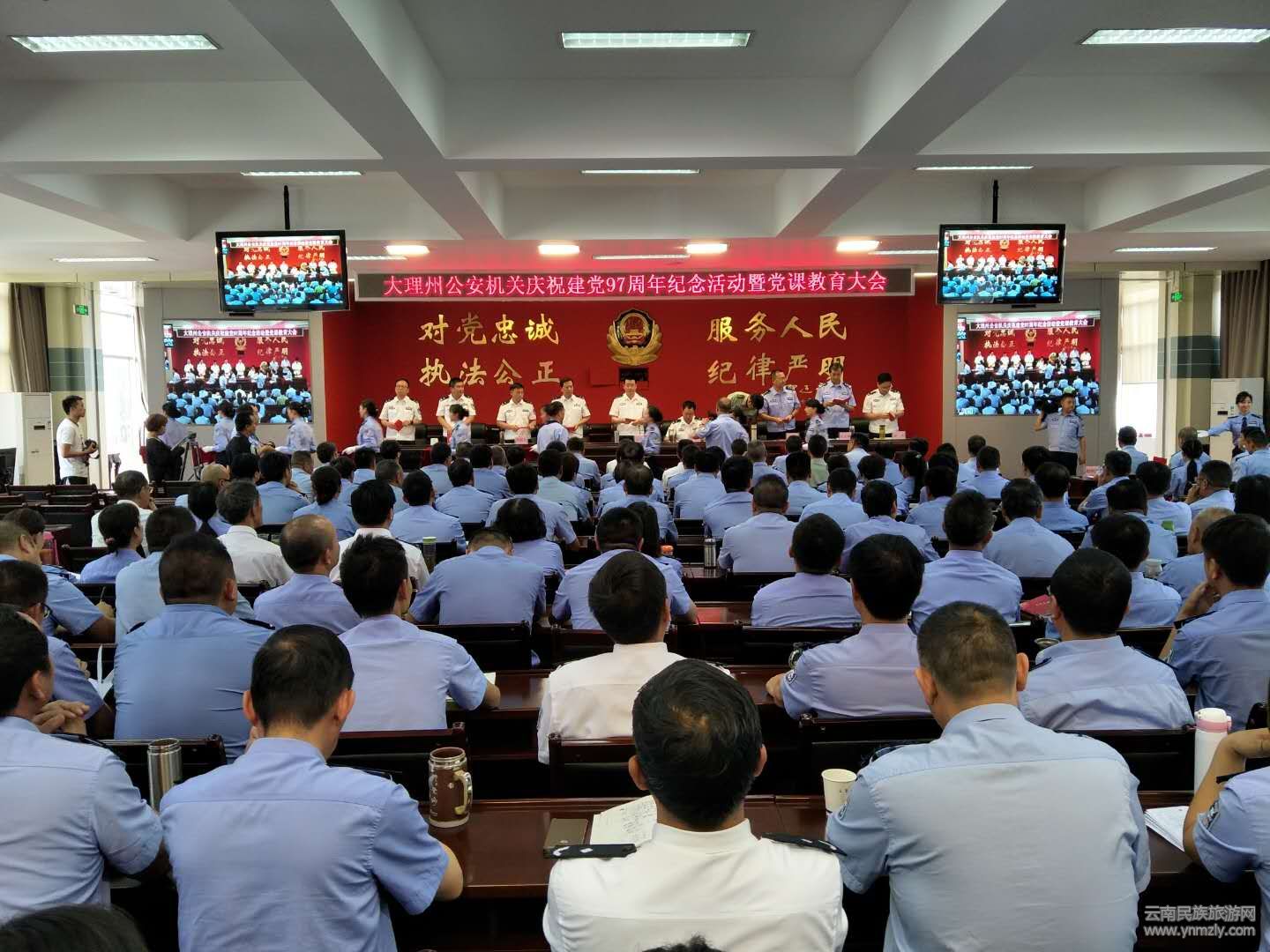 按照大理州公安局黨委“七一”系列慶祝活動(dòng)安排部署,6月28日,大理州公安局組織召開(kāi)全州公安機(jī)關(guān)慶祝建黨97周年紀(jì)念活動(dòng)暨黨課教育大會(huì),副州長(zhǎng)、州公安局黨委書記、局長(zhǎng)余其能出席活動(dòng)并為全州公安民警上黨課。會(huì)議由局黨委副書記吳學(xué)著主持,在家局黨委委員,機(jī)關(guān)全體黨員民警和退休黨員民警代表在主會(huì)場(chǎng)參會(huì),會(huì)議以視頻形式開(kāi)到12縣(市)公安局和交警支隊(duì)。