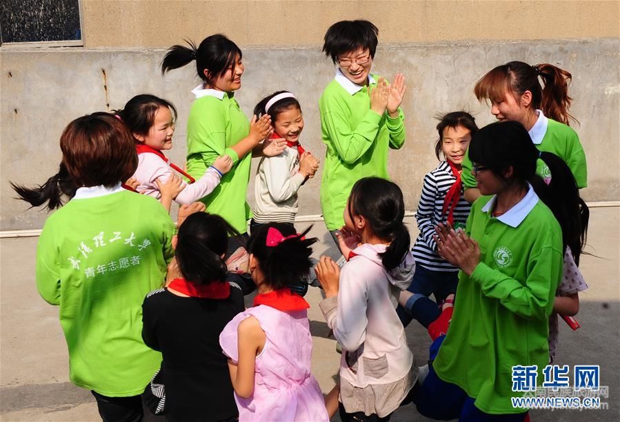 2011年4月28日,武漢理工大學(xué)研二學(xué)生郎坤和農(nóng)民工子弟學(xué)校武漢凌智小學(xué)的孩子們一起在屋頂平臺上做游戲。新華社記者 程敏攝