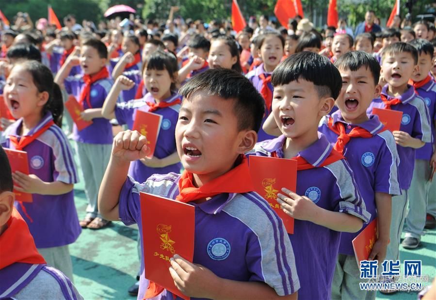 在2017年5月26日安徽省亳州市譙城區(qū)風(fēng)華小學(xué)舉行的入隊(duì)儀式上,孩子們在宣讀入隊(duì)誓詞。新華社發(fā)(張延林 攝)