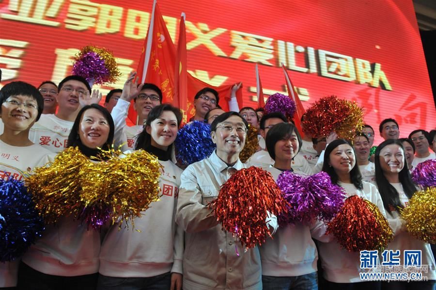 在2012年3月4日舉行的“中央企業(yè)郭明義愛心團(tuán)隊(duì)”授旗儀式現(xiàn)場,郭明義與愛心團(tuán)隊(duì)合影。新華社發(fā)(胡慶明 攝)