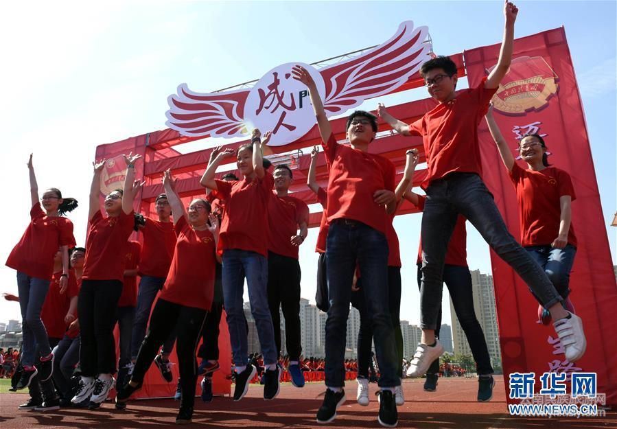 安徽淮南市第二中學(xué)學(xué)生穿越“成人門”(2018年5月4日攝)。新華社發(fā)(陳彬 攝)