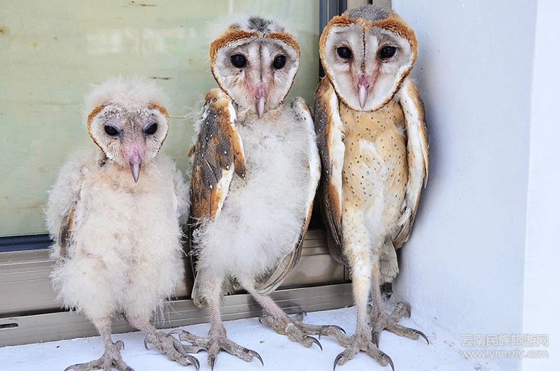記者去看猴面鷹“三兄妹”的時候,恰逢它們的進(jìn)食時間,飼養(yǎng)員拿來它們的食物,切得很小塊,很合它們的胃口,三兄妹吃得不亦樂乎。猴面鷹的樣子很獨特,面部真的好像猴子,有一圈像愛心一般的棕色的毛包裹著一圈白色的毛,紫粉色的鼻子,尖而長像彈殼一般的嘴巴垂在臉上,長著一雙黑灰色的“大長腿”。三兄妹一個挨著一個昂首挺胸地站在窗臺上,從大到小依次排好,簡直萌化了。它們的眼睛又大又圓,炯炯有神,像兩只透明的彈珠鑲嵌在臉上。三兄妹的視線很有默契,會盯著同一個物體,統(tǒng)一幅度的擺動身體,“三眼驚愕”的樣子可愛極了。兩只稍微大點的羽翼大部分已經(jīng)長出來了,羽毛呈現(xiàn)出棕黃色,而最小的一只羽翼還未長出來,全身白花花,毛茸茸的,老三的頭上頂著一撮白毛,像足了一個小雪球。老大真的是一副“大哥”的樣子,完全hold住了全場,身體站的特別筆直,一動不動,起到了模范帶頭作用,老大的右爪向身體的右前方邁出了一大步,儼然一副稍息的樣子,讓人忍俊不禁。老二則用羽翼遮住胸前,大概是怕大家看出它吃撐了的樣子吧,老三就比較調(diào)皮,頭一左一右地?fù)u擺著,在“隊伍”里跳起了舞,似乎在跟大家說:讓我們一起搖擺,一起搖擺……