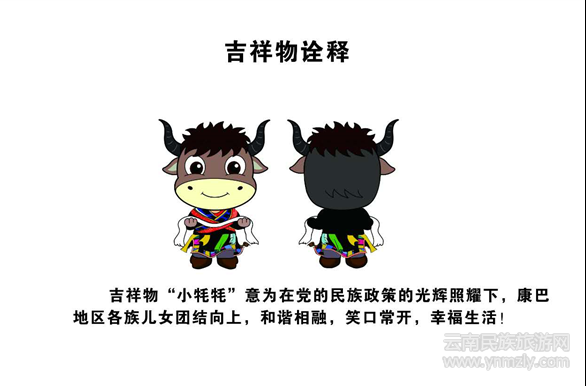 吉祥物名叫“小牦牦”,以康巴藏區(qū)最典型的動物牦牛為原型,牦牛素有“高原之舟”的美譽,最能集中體現(xiàn)吃苦耐勞,勤勞勇敢,樂于奉獻的精神,在藏區(qū)具有廣泛的代表性。吉祥物設(shè)計富有動感,活潑可愛,意為在黨的民族政策的光輝照耀下,康巴地區(qū)各族兒女團結(jié)向上,和諧相融,笑口常開,幸福生活!