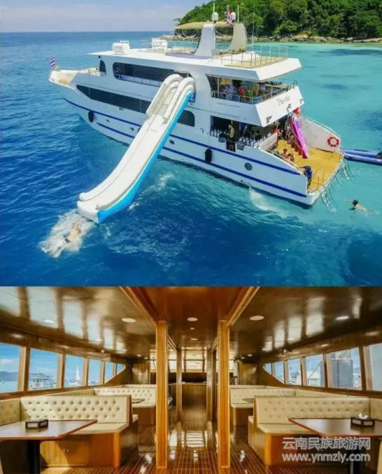 資料顯示,“鳳凰號(hào)”寬8米,長(zhǎng)38米,最大載客量為200人。其內(nèi)部分為4層,底倉(cāng)是廚房和休息室,首層為餐廳和潛水裝備區(qū),二層為船長(zhǎng)室、露天、室內(nèi)休息室和兒童戲水區(qū);三層則為陽(yáng)光甲板,配備按摩浴缸,同時(shí)設(shè)有滑梯,游客可以體驗(yàn)直沖入海。