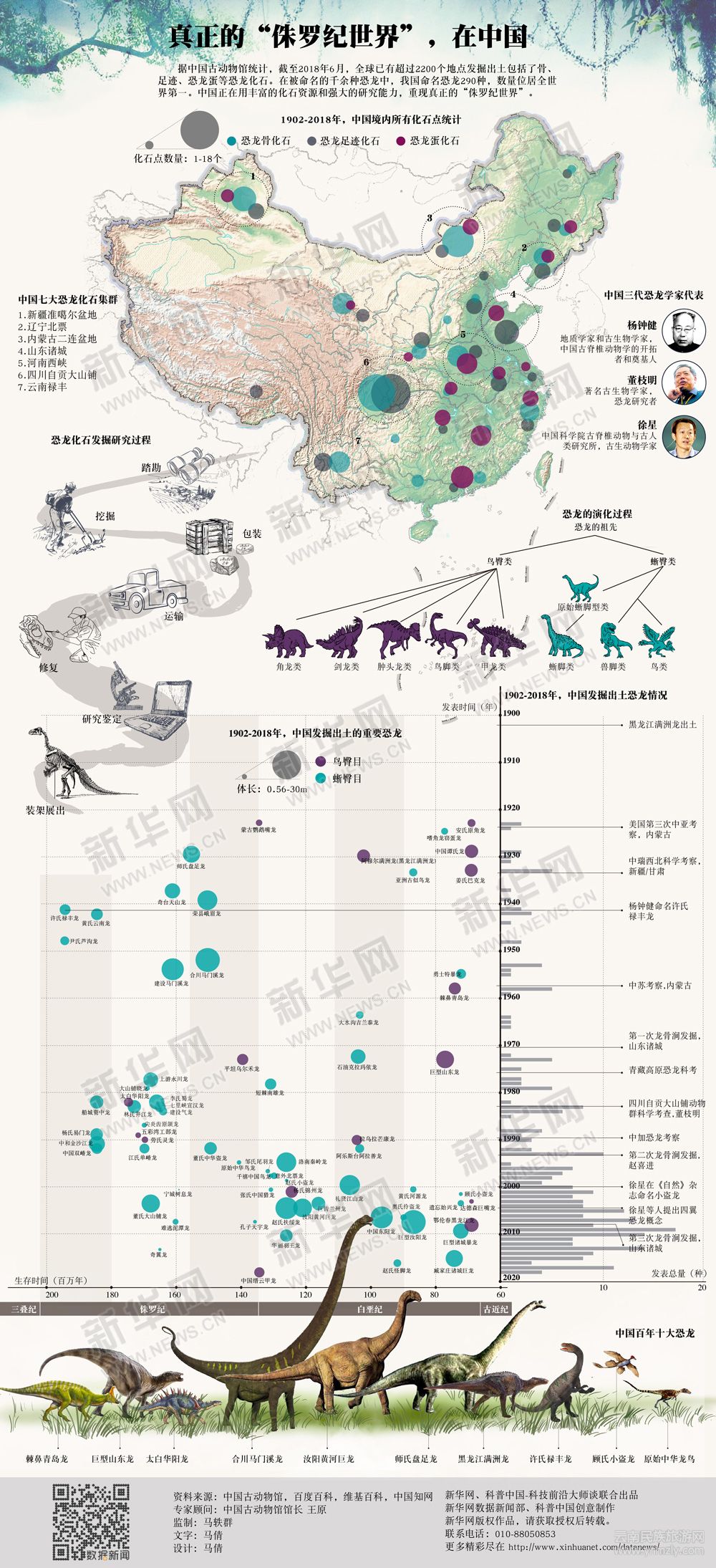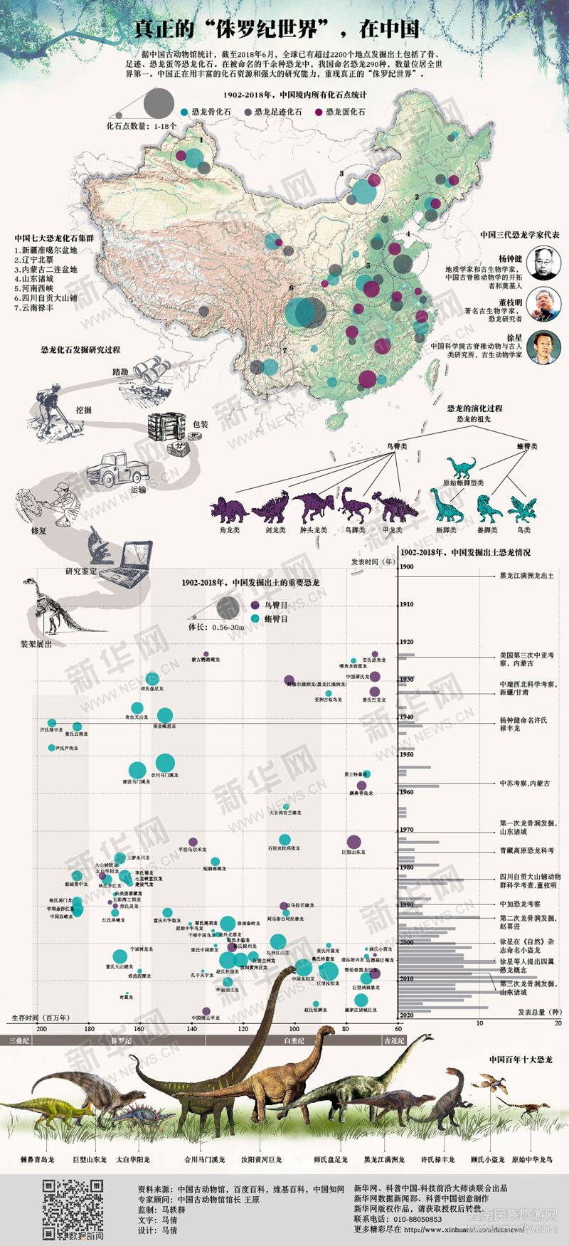 據(jù)中國(guó)古動(dòng)物館統(tǒng)計(jì),截至2018年6月,全球已有超過(guò)2200個(gè)地點(diǎn)發(fā)掘出土包括了骨、足跡、恐龍蛋等恐龍化石。在被命名的千余種恐龍中,我國(guó)命名恐龍290種,數(shù)量位居全世界第一。中國(guó)正在用豐富的化石資源和強(qiáng)大的研究能力,重現(xiàn)真正的“侏羅紀(jì)世界”。